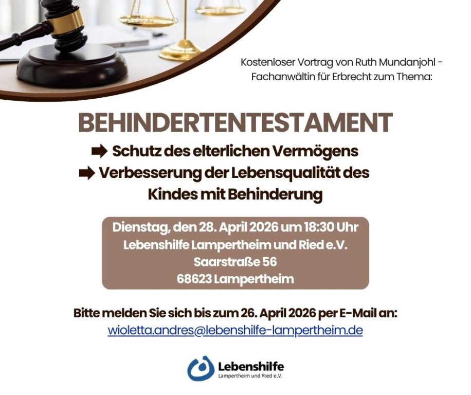 https://www.lebenshilfe-lampertheim.de/wp-content/uploads/2026/03/Behindertentestament_Flyer-Facebook-Post-916x768.jpg 916 768 Lebenshilfe Lampertheim und Ried e.V. Lebenshilfe Lampertheim und Ried e.V. https://www.lebenshilfe-lampertheim.de/wp-content/uploads/2026/03/Behindertentestament_Flyer-Facebook-Post-916x768.jpgDie Lebenshilfe Lampertheim und Ried e.V. lädt Sie herzlich zum Vortrag am Dienstag, den 28. April 2026 um 18:30 Uhr in der Lebenshilfe Lampertheim und Ried e.V., Saarstr. 56, 68623 Lampertheim, ein. Der Eintritt ist frei. Bitte…